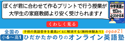 ※中高大の先生や塾、予備校の先生がススメた初級英文法の優良本の出版契約を終了し、公開しています! 2. 中学英語攻略マニュアルと特典の「英文法問題集プリント」で勉強する ※過去問20点の中3に1カ月で公立入試で85点を取らせた実績もある、4000人以上が学習した教材です 3. 1ができない重症の君は で授業を受ける※通知表で4を取ったり、テストで80点台を取るなどの目標を達成したら、いつでもやめられます |