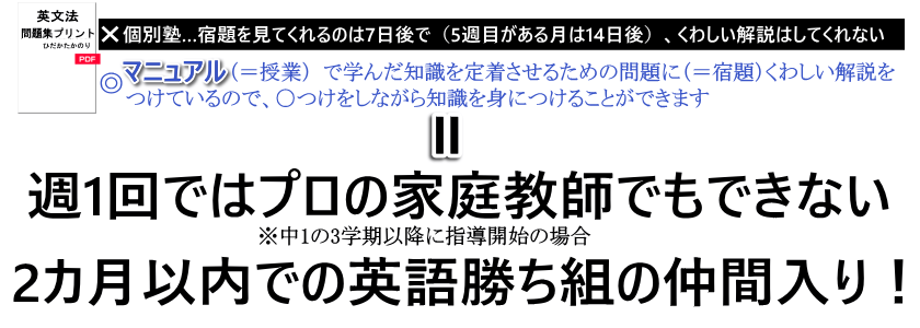 マニュアルと特典の教材を手にすれば、英語が苦手だったご父母でも大学生を超える指導力をつけられるようなものですが、上記個別指導塾の1カ月目にかかる月謝(授業料+教室維持費+1学年分の教材費)と同じくらいの