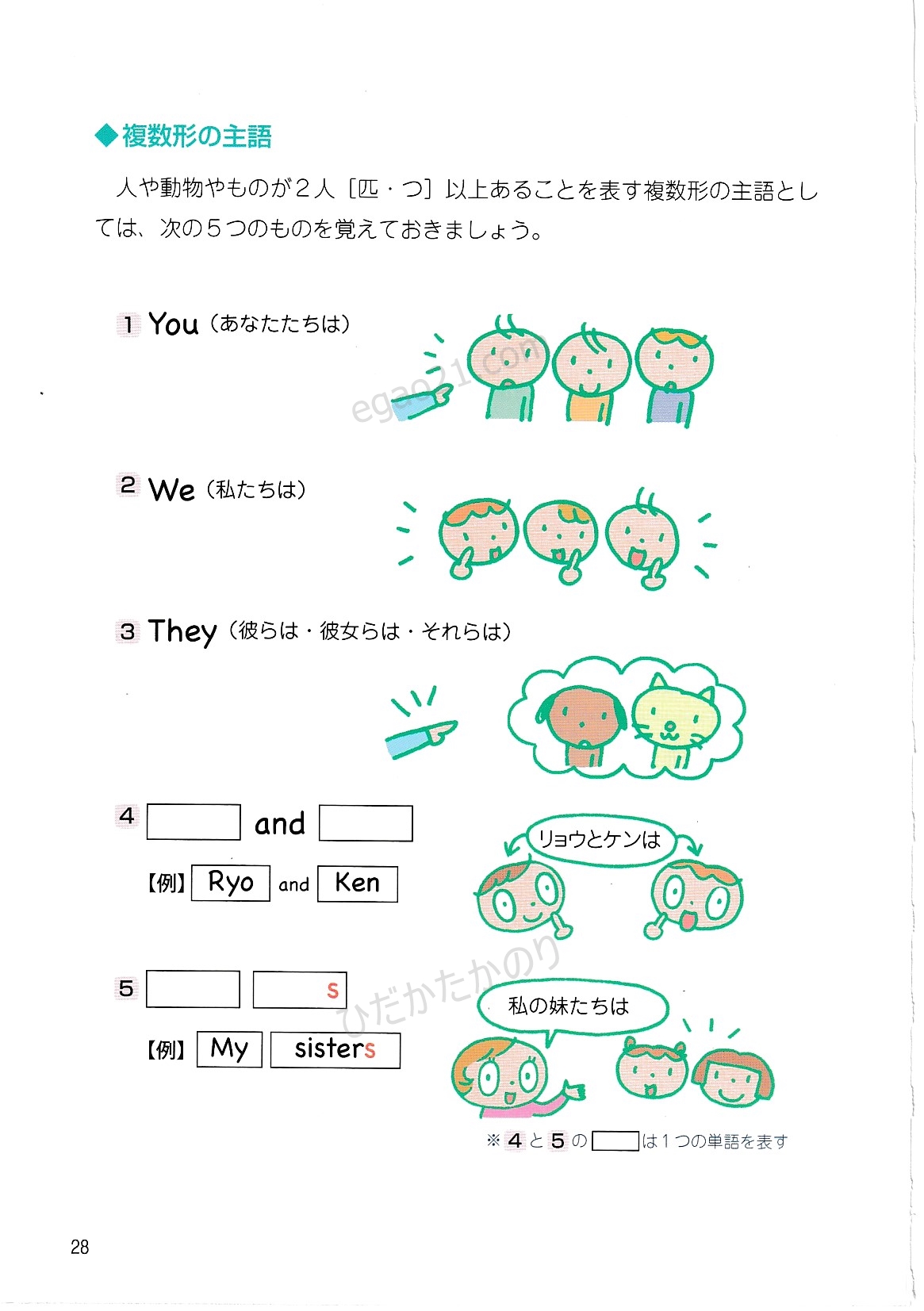 特に、主語として使われることのある1~5の知識は、am, are, isとwas, wereの使い分けや一般動詞に3単現のsをつけるかどうかの問題、受動態の文を作る時に使うbe動詞の使い分け、現在完了のhaveとhasの使い分けで必要になるので、必ず覚えておきましょう!