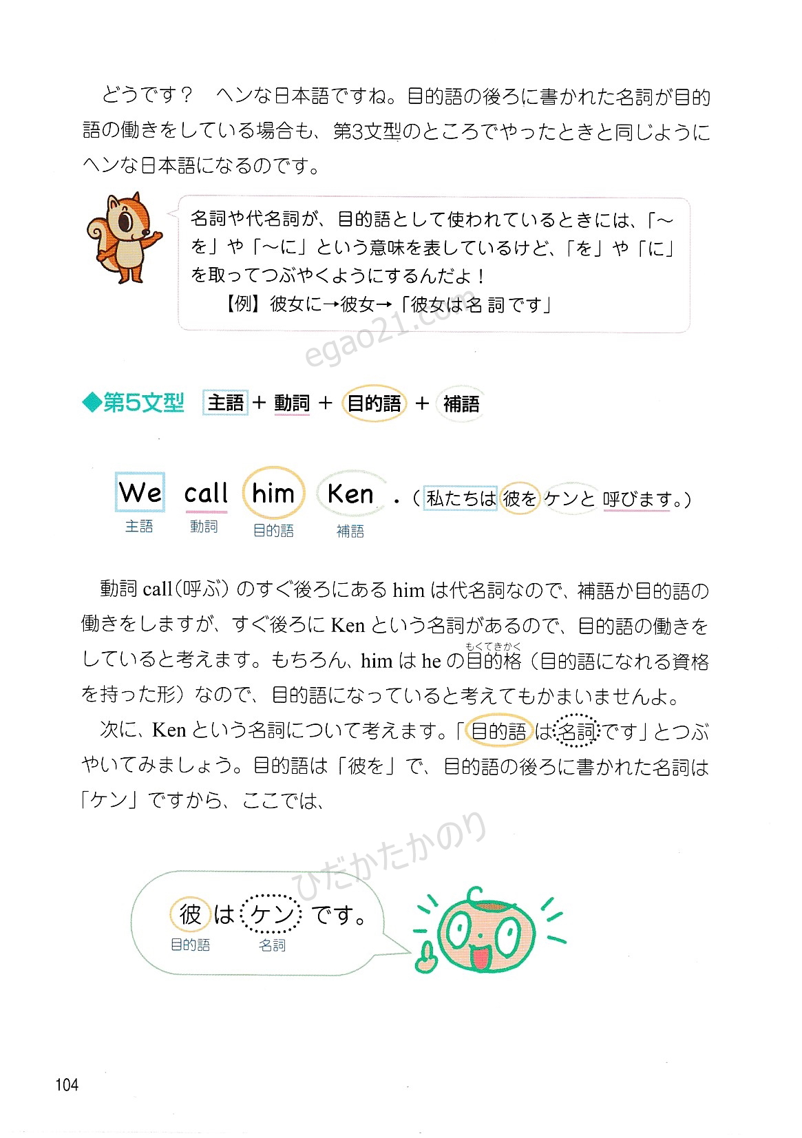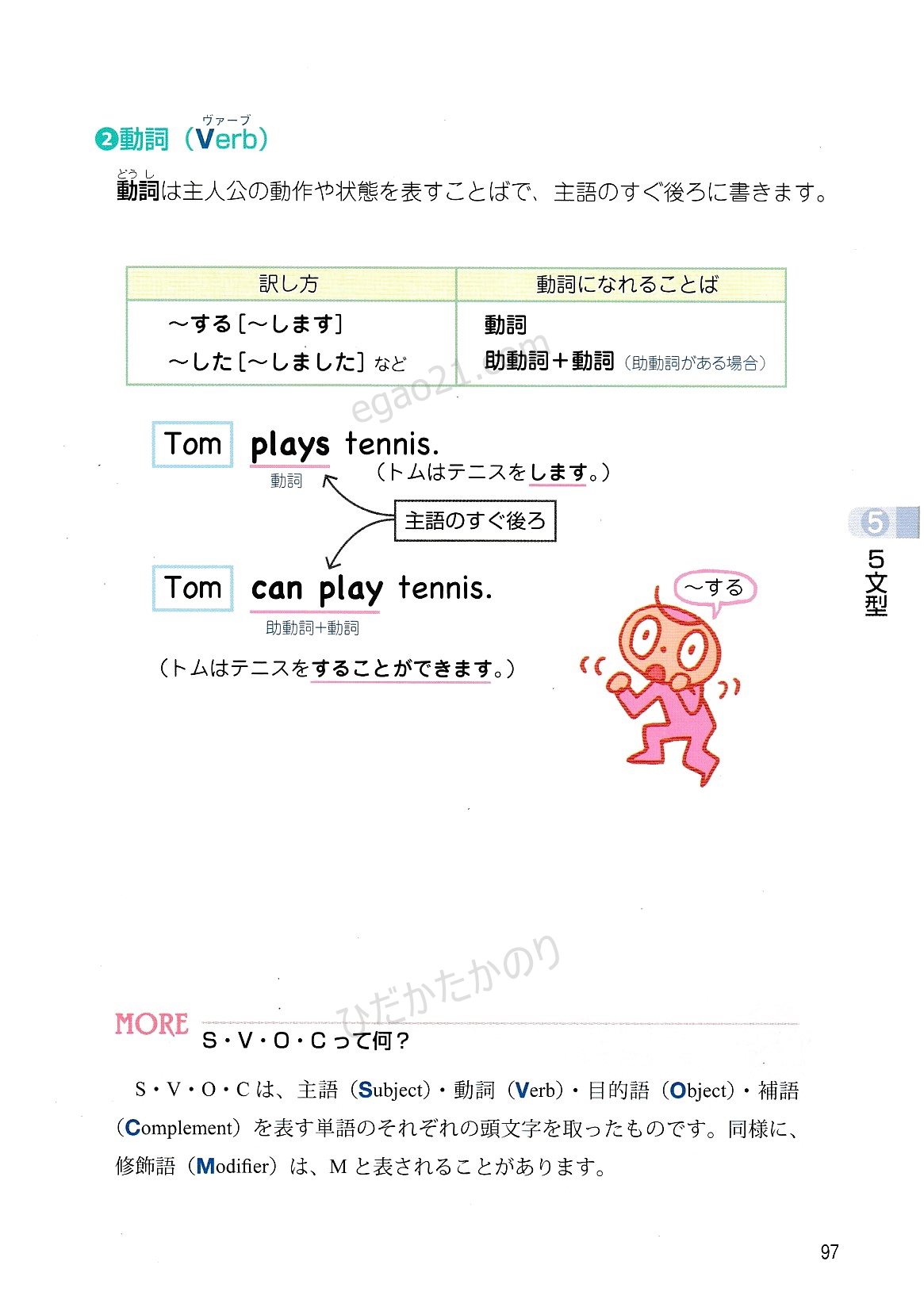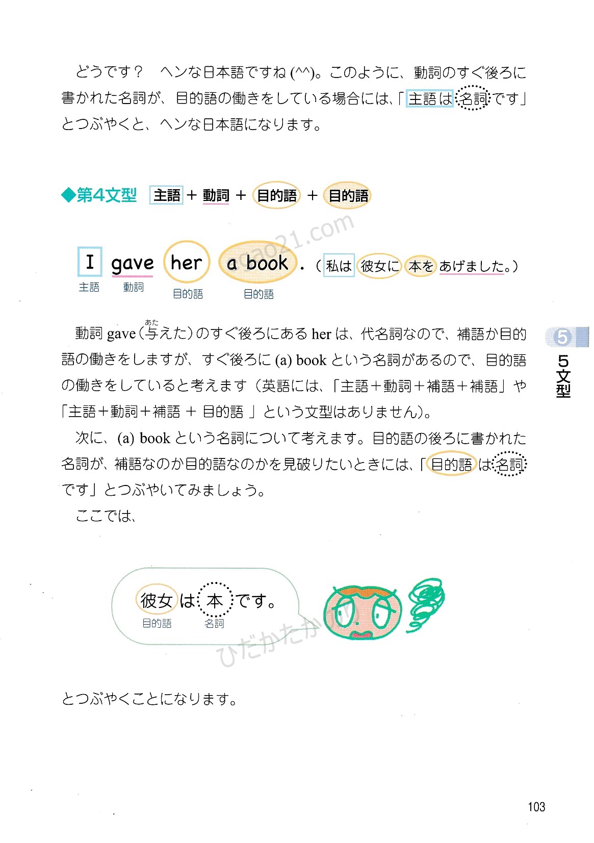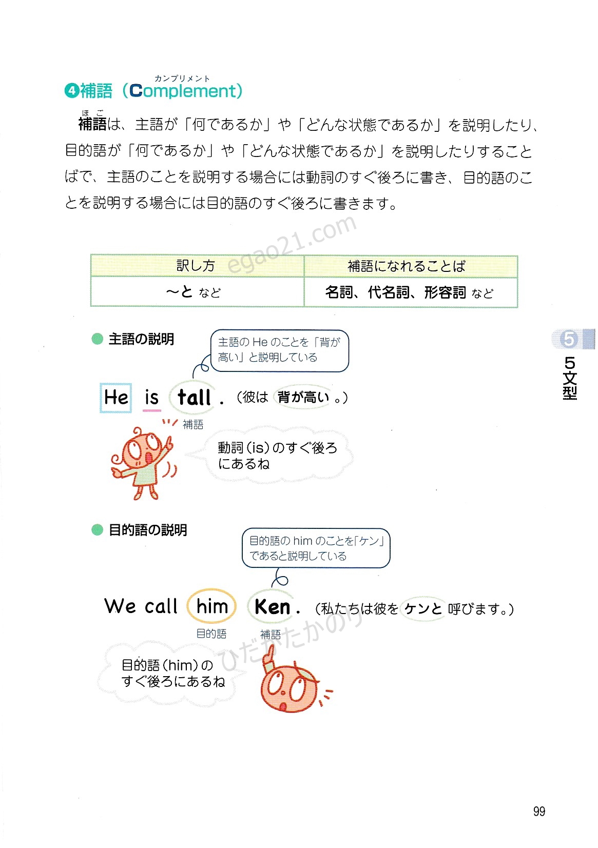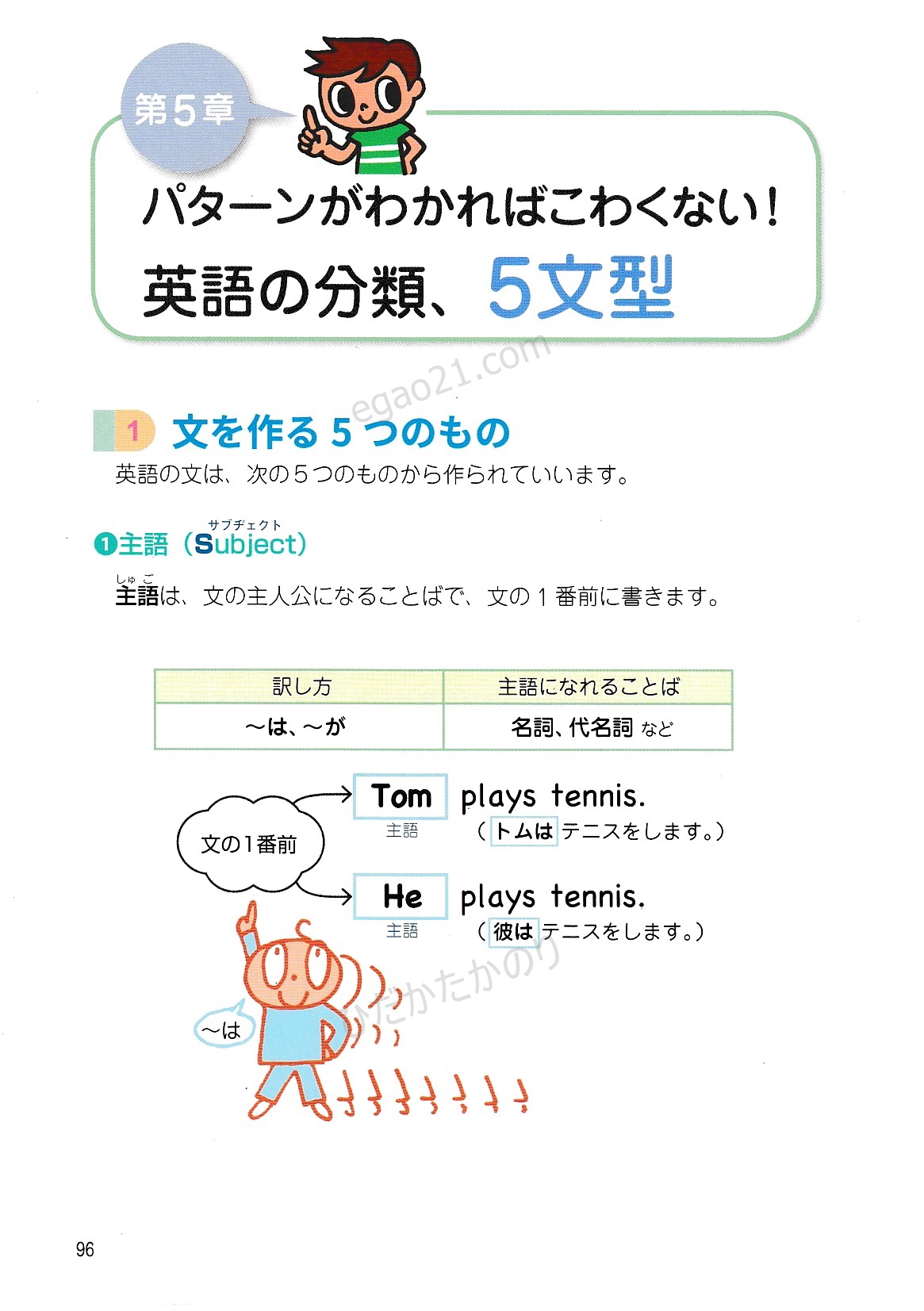 「トコトンていねいな英文法レッスン」の第5章(5文型-第1文型〔SV〕、第2文型〔SVC〕、第3文型〔SVO〕、第4文型〔SVOO〕、第5文型〔SVOC〕、主語、動詞。目的語、補語)を無料で公開しています。
