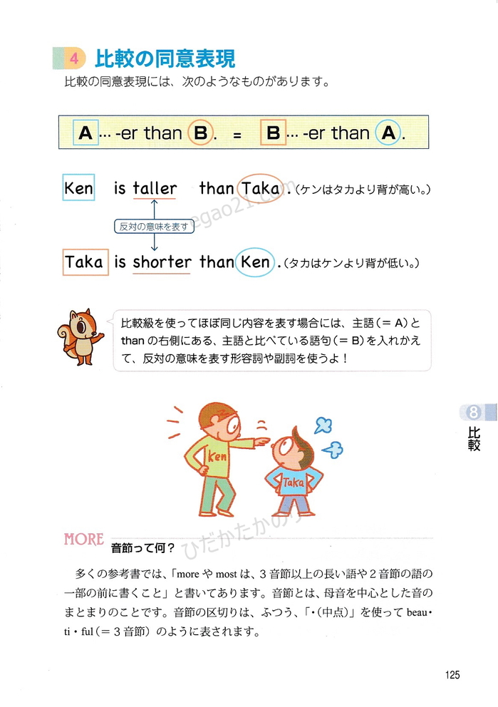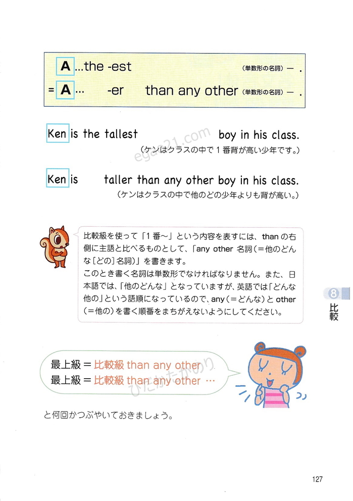「トコトンていねいな英文法レッスン」 第8章 (比較-原級、比較級、最上級を使った文、erのつけ方、estのつけ方、つづりの長い形容詞や副詞の比較級や最上級を使った文)